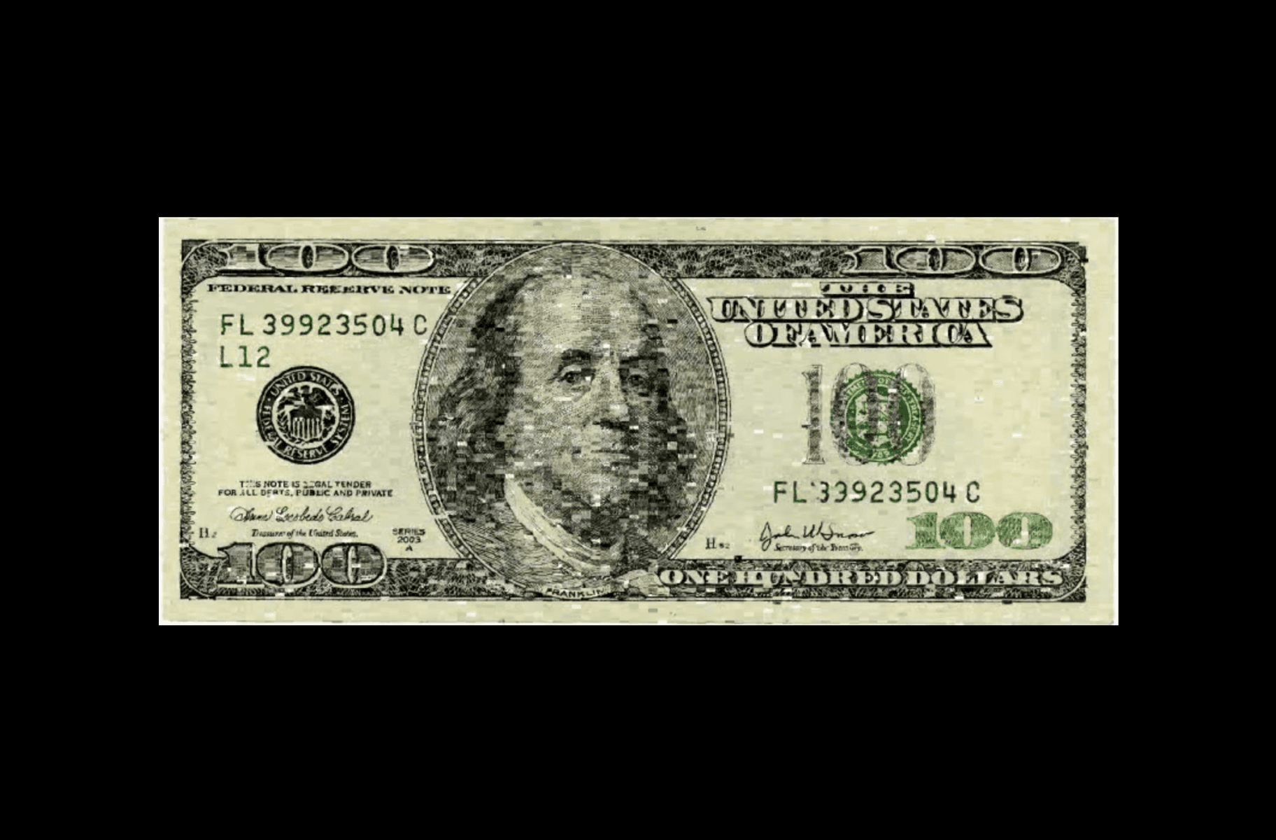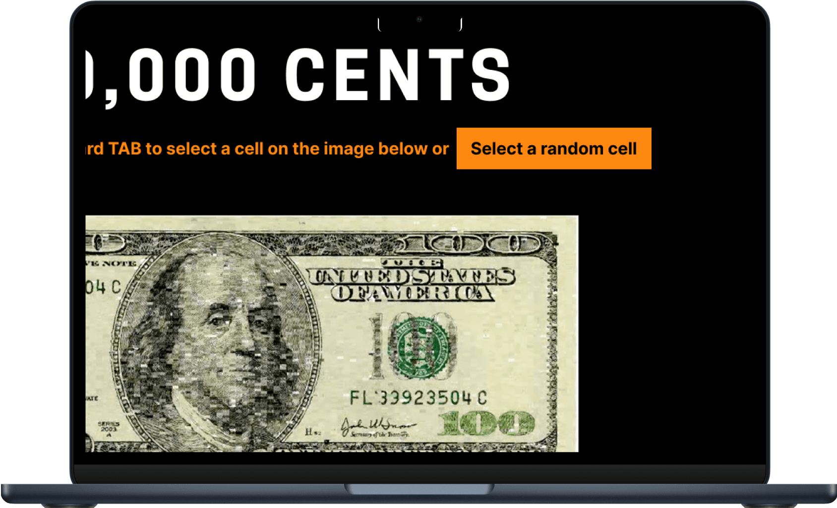 Ten Thousand Cents is a digital art project by Aaron Koblin and Takashi Kawashima that crowdsourced the recreation of a $100 bill. The designers split a high-resolution scan of the bill into 10,000 pieces and paid workers on Amazon Mechanical Turk one cent ($0.01) each to redraw a piece using a custom Flash tool without knowing the final image. Over five months, anonymous contributors from 51 countries helped generate the complete bill for exactly $100.