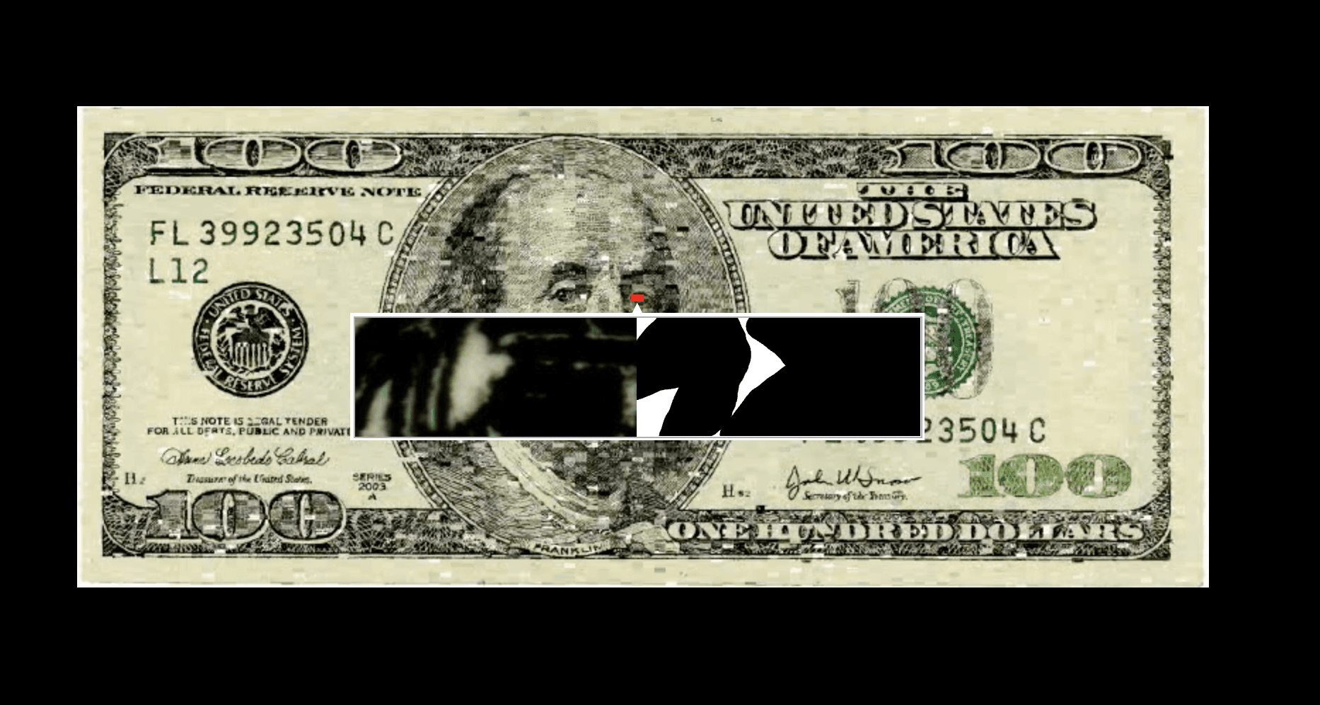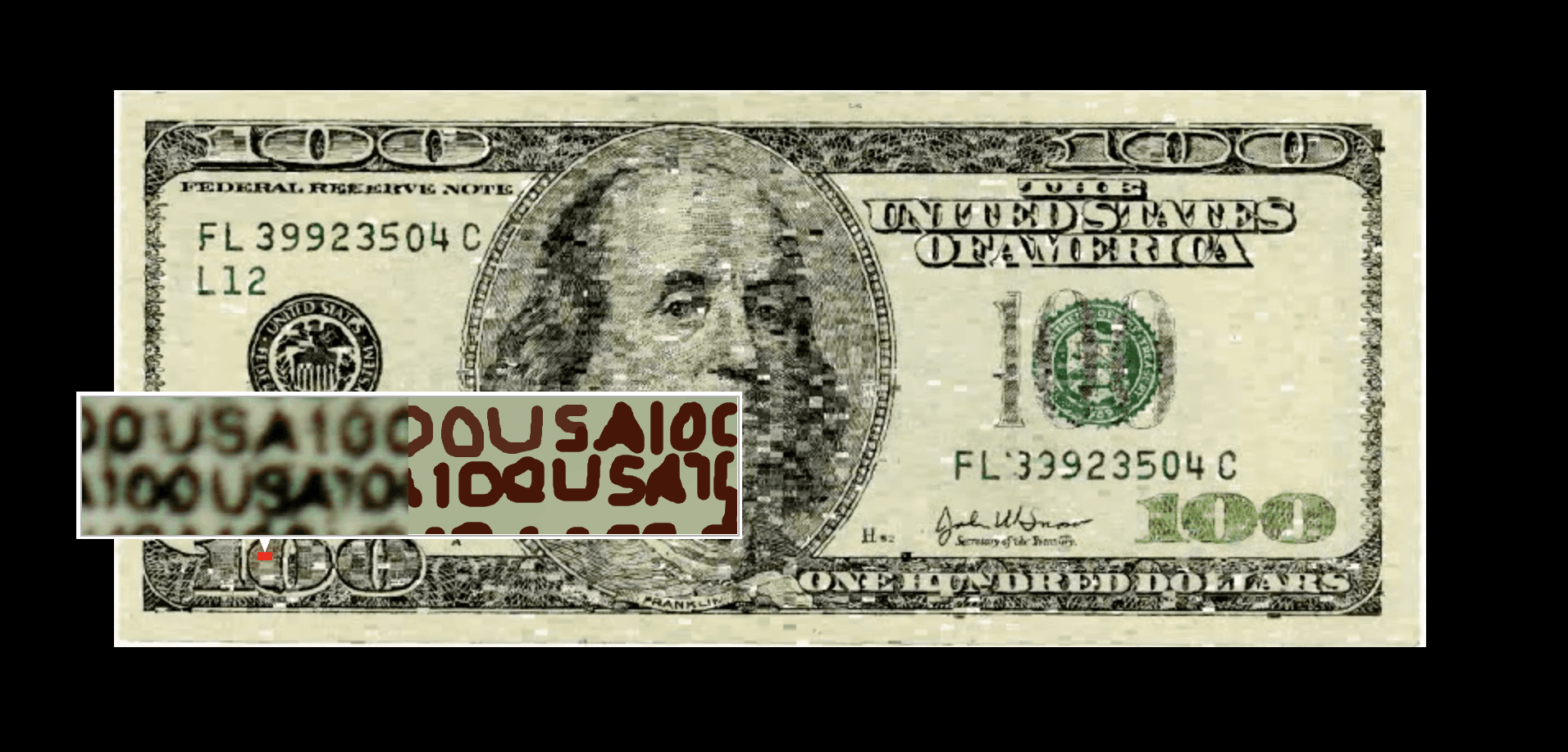 Cell in the second 0 of the 100 at the bottom left of the bill. The zoomed in original image shows “100USA” microprinted in this section. The artist re-did their work multiple times, and nearly matched the pattern.