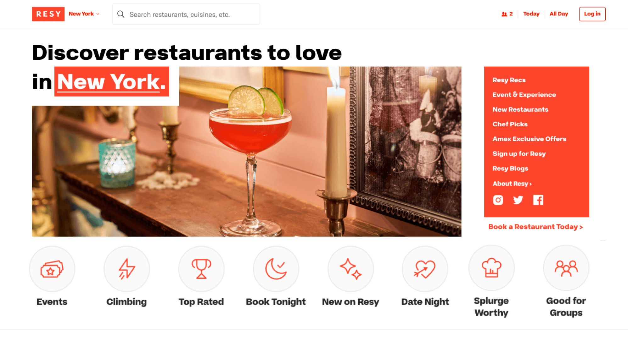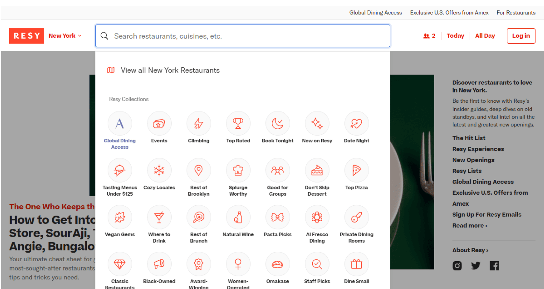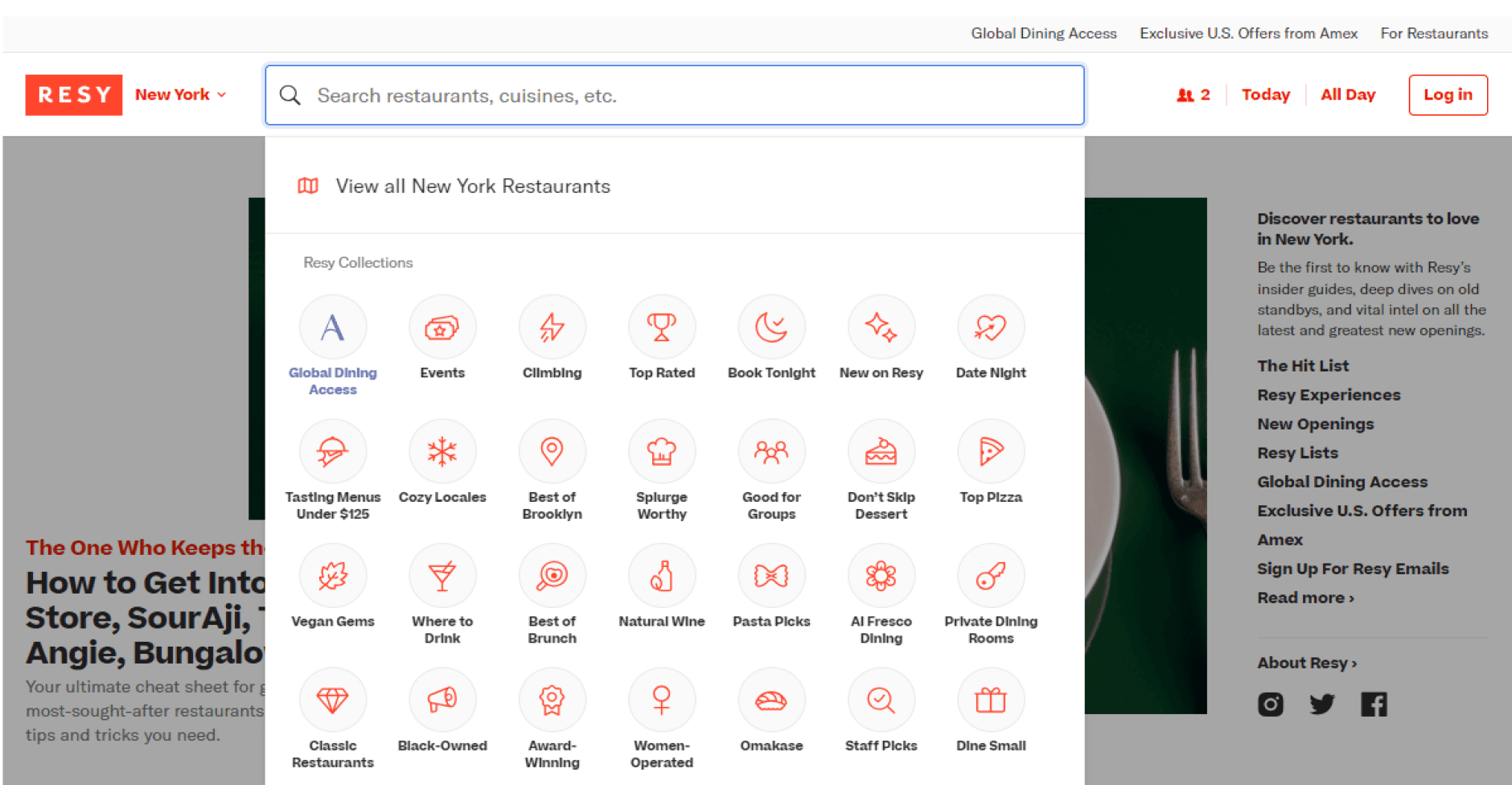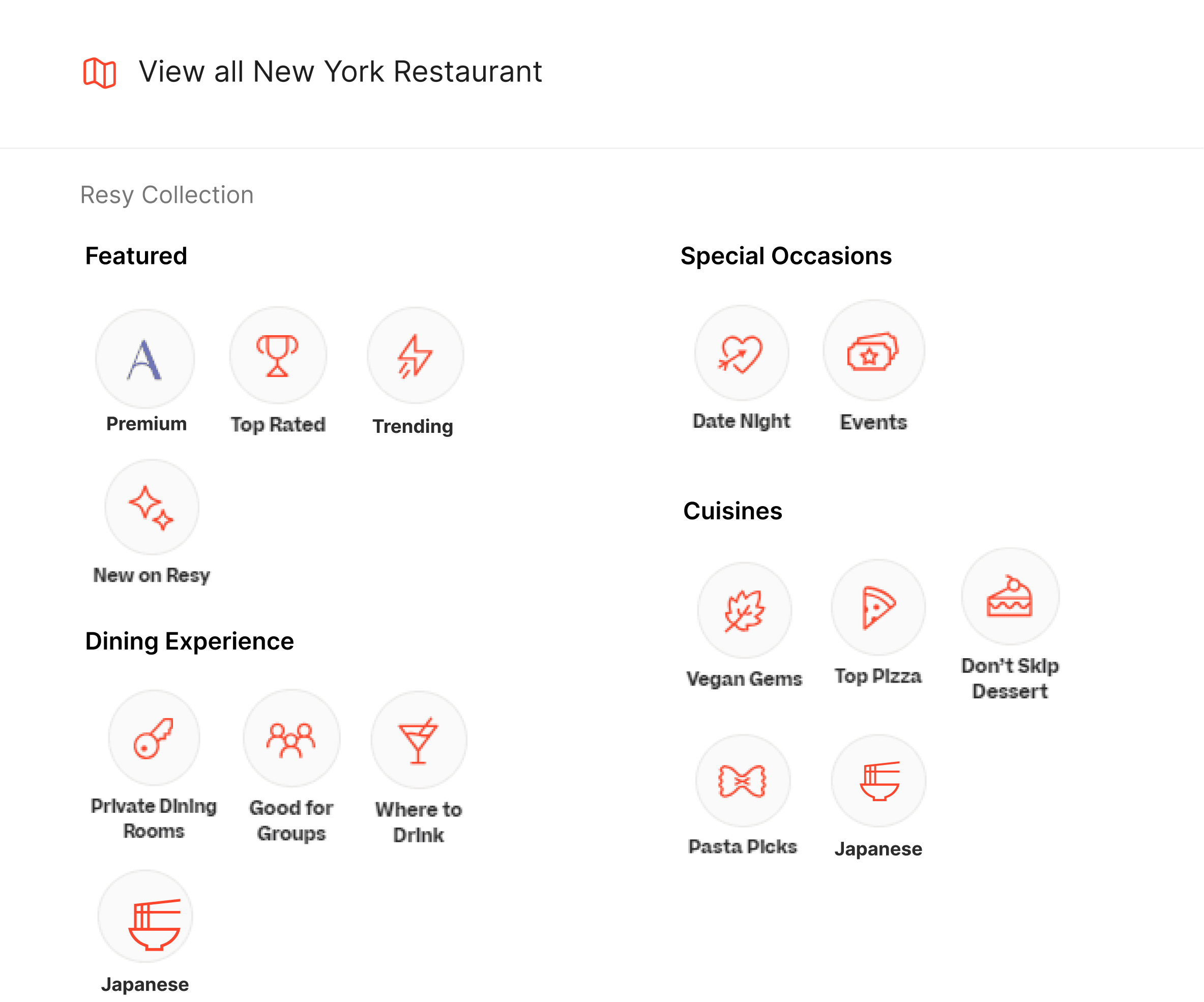 The Resy search interface confuses users by using unclear and inconsistent category labels, like "Events", “Global Dining” and "Climbing," instead of familiar filters like cuisine types ("Italian," "Mexican").