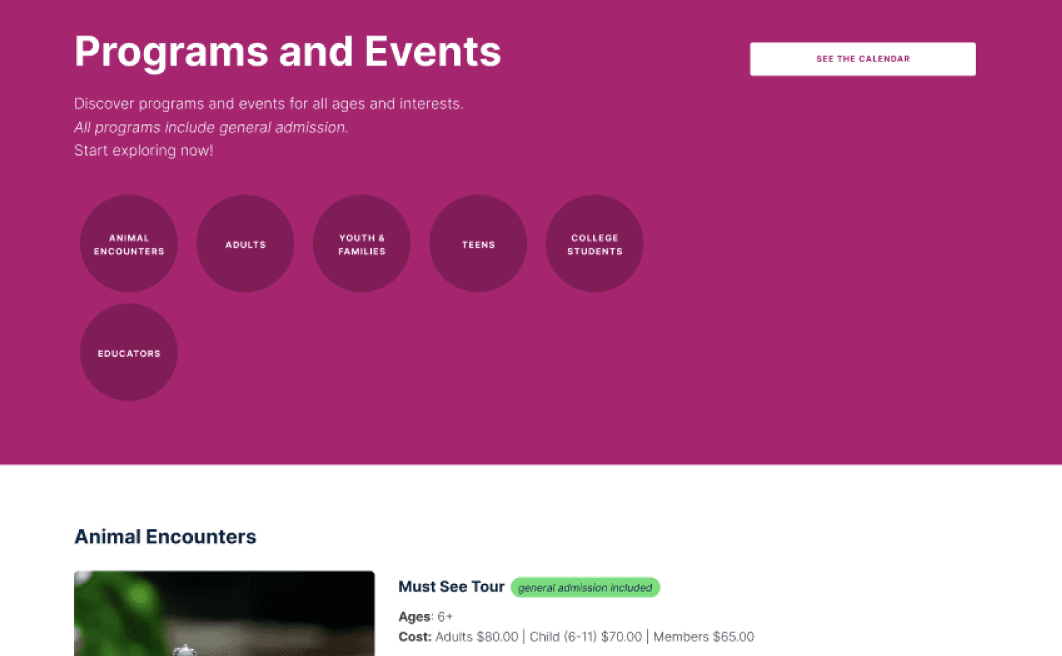 The "Programs & Events" section of Shedd Aquarium's website showcases a variety of special experiences, such as animal encounters, educational programs, and seasonal events. Visitors can browse upcoming activities, view detailed descriptions, and easily purchase tickets. The section aims to provide engaging, informative, and accessible opportunities for users to explore Shedd’s offerings beyond the standard exhibits.